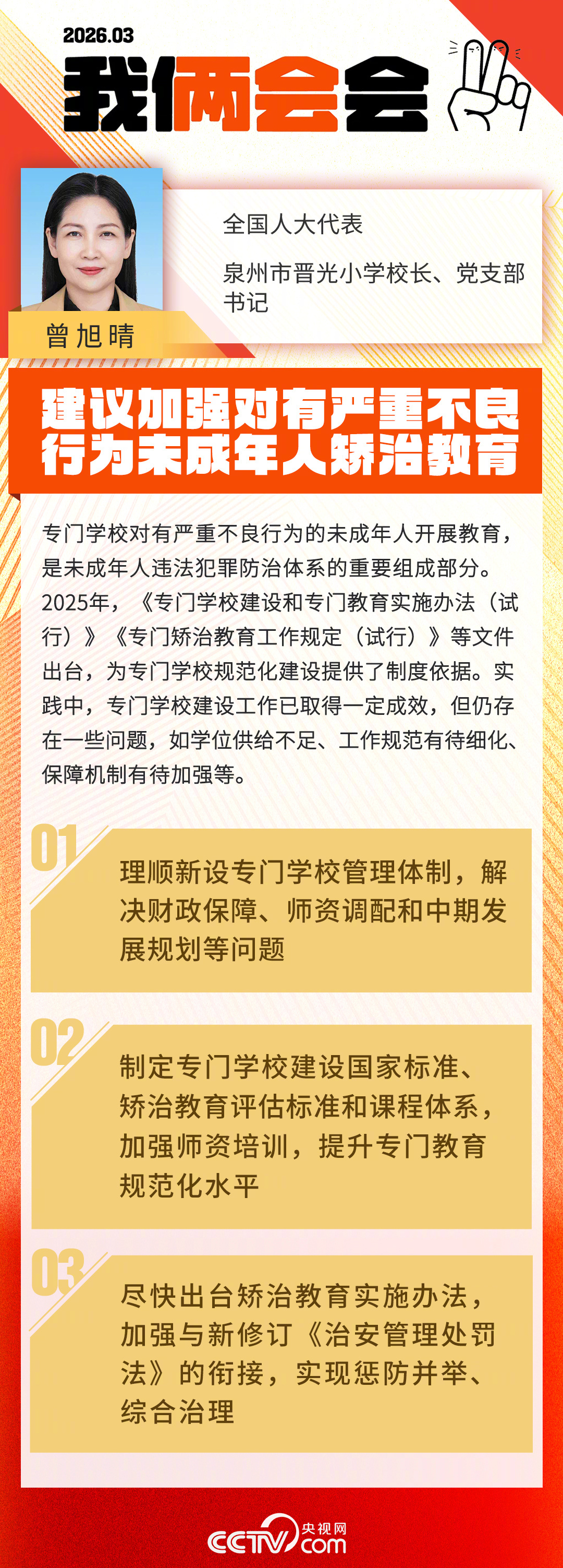 对此,全国人大代表、泉州市晋光小学校长、党支部书记曾旭晴建议:推动解决财政保障渠道、师资力量调配和中期发展规划等问题;制定专门学校建设国家标准、专门矫治教育量化评估标准和课程体系,加强师资培训;同时尽快出台矫治教育实施办法,加强其与新修订《治安管理处罚法》的衔接,实现矫治教育与前端预防、后端打击的有机统一。